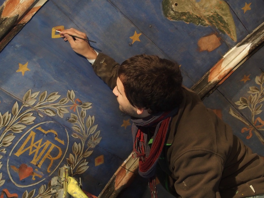 Un traitement différent a été réservé aux bois neufs. Les peintres ont élaboré pour le fond bleu un mélange analogue à la texture d'origine avant de recréer étoiles, fleurs de lys, médaillons et angelots à l’aide d'une peinture adaptée.