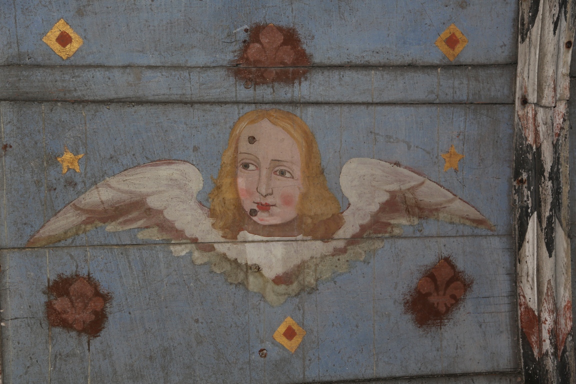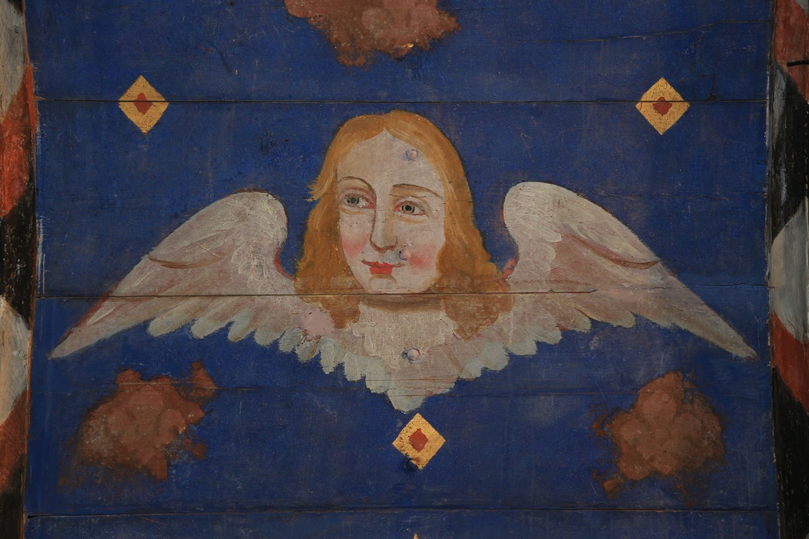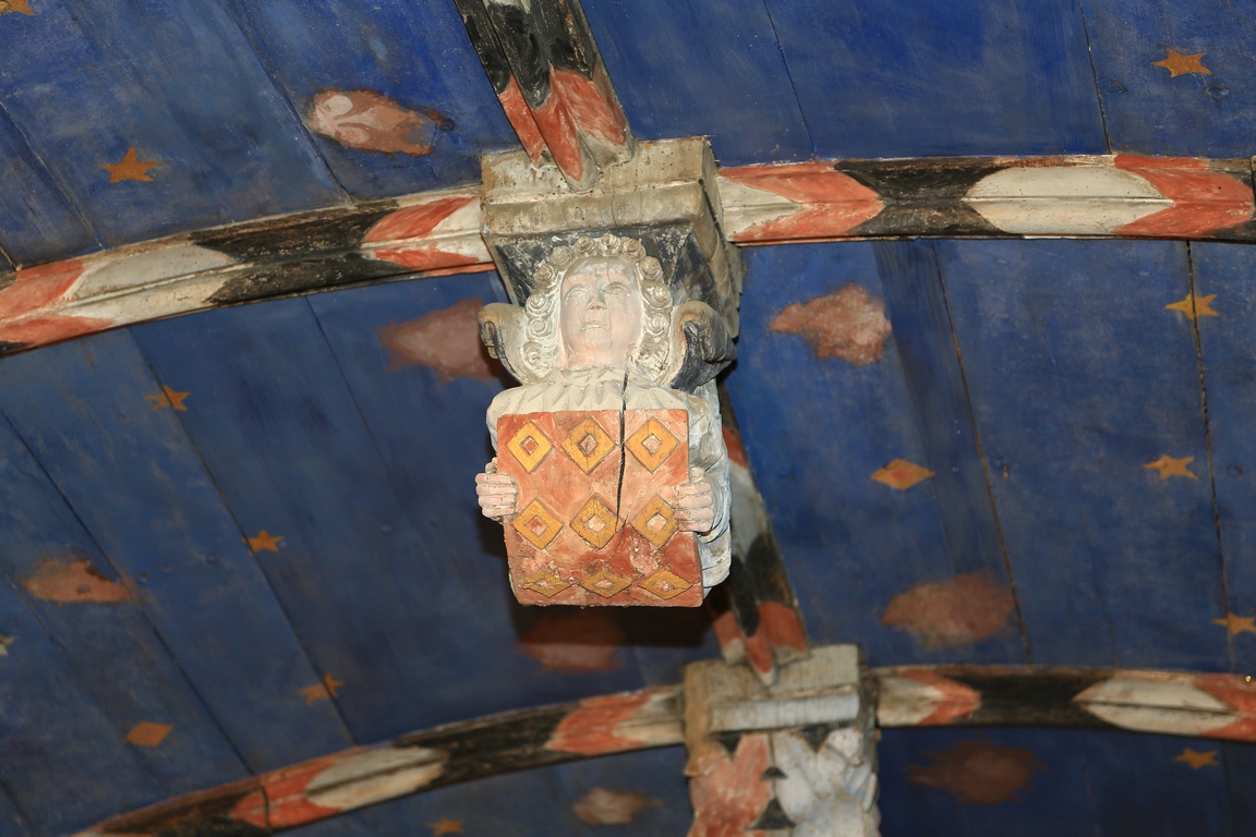 Les églises du Moyen Âge étaient peintes. Lors des restaurations du XIXe siècle, les artisans ont peint les lambris de la voûte : le bleu du ciel a été conçu avec une technique « à l'œuf » et les anges et médaillons peints à l'huile.